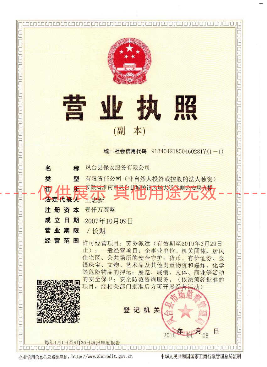 鳳臺保安服務有限公司成立于2007年,是經鳳臺縣公安局行政許可的經營企業,注冊資金1000萬元,具有國企背景(安徽州來控股有限公司),更是一家朝氣蓬勃的年輕企業。公司主營勞務派遣、保安服務、武裝押運等。 >>了解更多